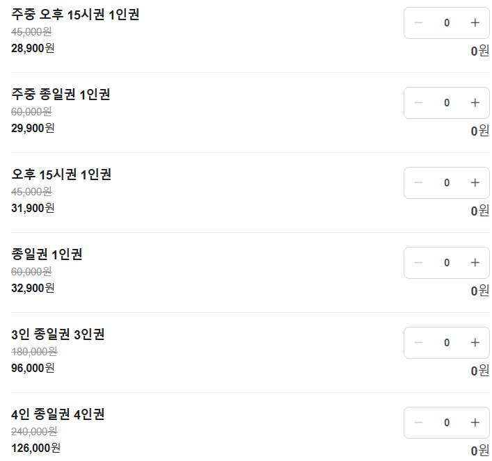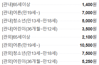 가격 : 위의 이미지 처럼 관외 기준 어른 10,500원 아이 5250원 입니다. 3인가족 대략 26000원 정도 발생합니다.