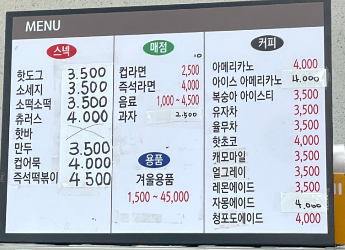 매점 내 사진은 못찍었지만 매점 내 식음료 가격들 공유드립니다.