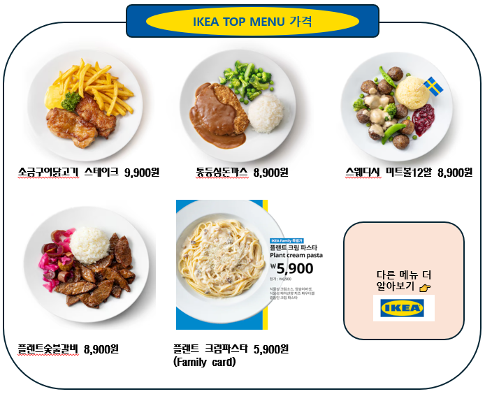 - 스웨덴 미트볼, 연어 스테이크, 크림케이크 등 이케아만의 특별한 메뉴를 맛볼 수 있어요.