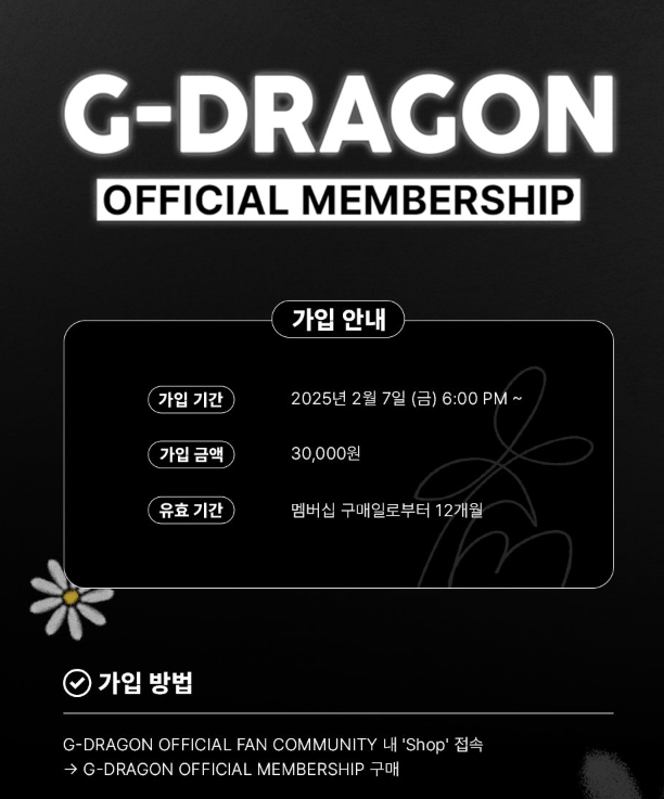- G-DRAGON 공식 팬클럽 멤버십의 가격은 ₩30,000입니다.